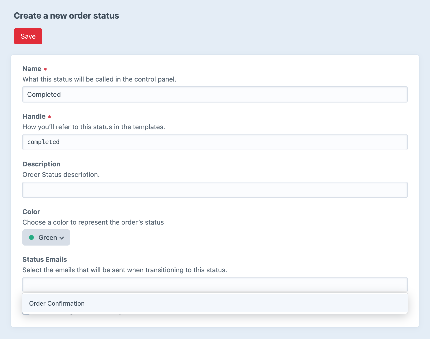 For example, you might create an email called “Customer Order Confirmation” which emails a completed order summary to the customer. This would be linked to the default order status since we want it to trigger when the cart’s completed and becomes an order.